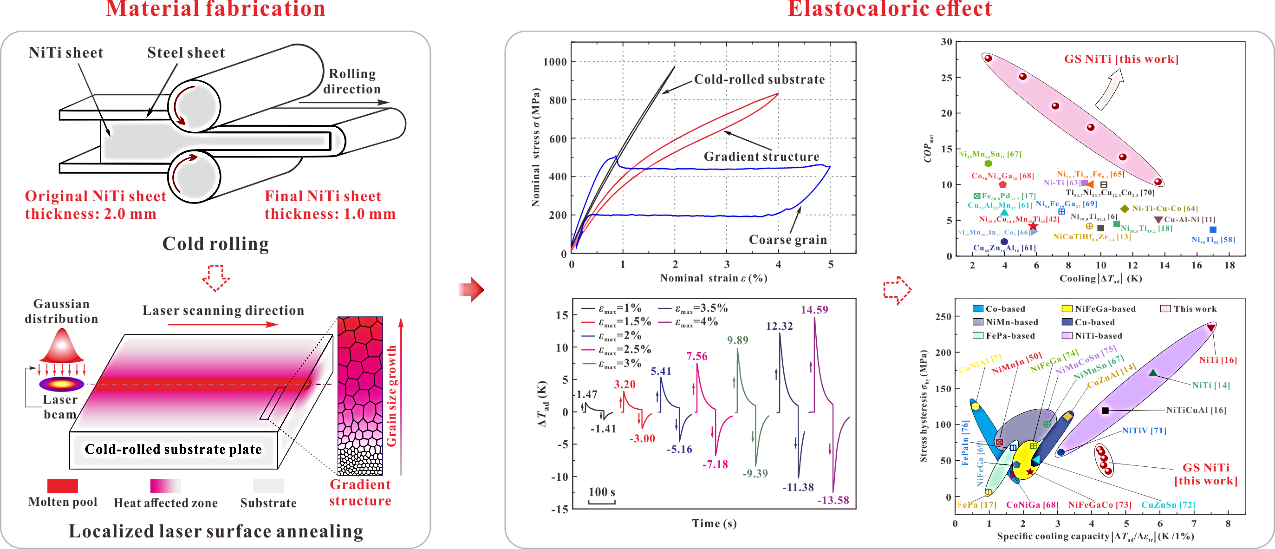 该论文介绍了机械系副教授方刚课题组在固态制冷材料研究方面的进展,该研究通过强塑变轧制(形成整体细晶基体)和激光退火(形成局部粗晶)相结合的方法成功制备出具有梯度晶粒结构的镍钛合金,使其突破了强度-延展性、低滞后和高潜热之间的掣肘,实现该材料固态制冷性能的显著提升。陈俊余为第一作者,方刚为通讯作者。
