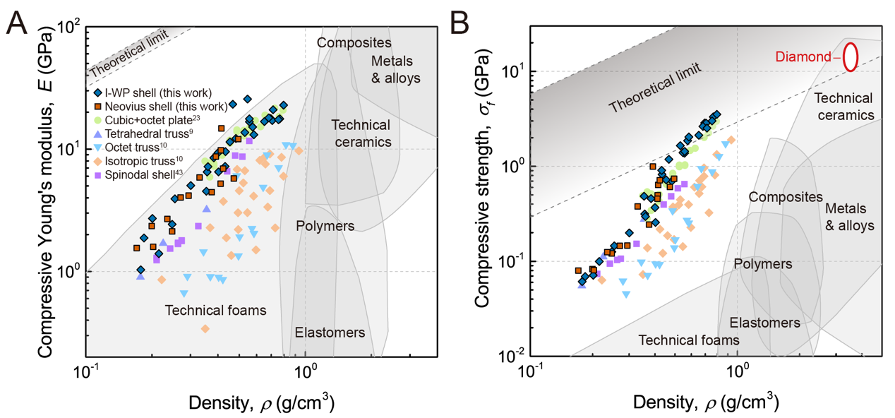 图2.极小曲面热解碳纳米点阵材料与其他材料的力学性能对比