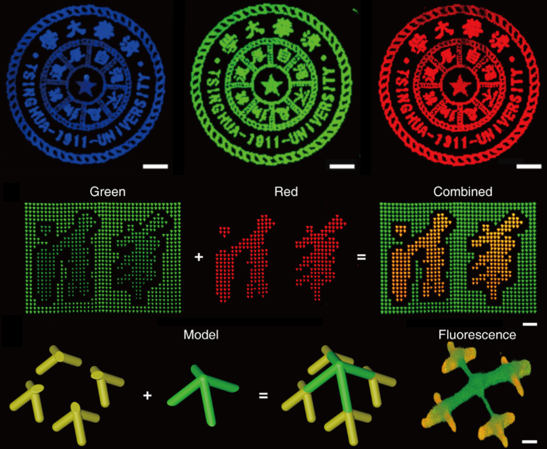 基于以上原理,研究团队进一步对激光束进行聚焦与程序化扫描,实现了纳米材料复杂三维结构的精密成型。与现有的微纳加工制备技术相比,这项技术具有以下鲜明特征。打印材料纯度高:与现有的激光3D纳米打印技术相比,这项技术突破了光聚合的原理限制,不需要任何光学粘合组分,实现了接近100%功能纳米粒子组分的3D打印;三维加工能力强:能够实现复杂线性、弯曲和体结构等多种三维结构的纳米打印(图2);打印分辨率高:利用非线性光激发,使打印分辨率突破光学衍射极限,打印点阵列密度超过20000ppi,打印极限分辨率达到77nm,并在大规模阵列化加工保持优良的均一性;具备多组分打印功能:以不同尺寸的量子点作为原料,这项技术还展示了多组分的异质复合打印能力(图3)。