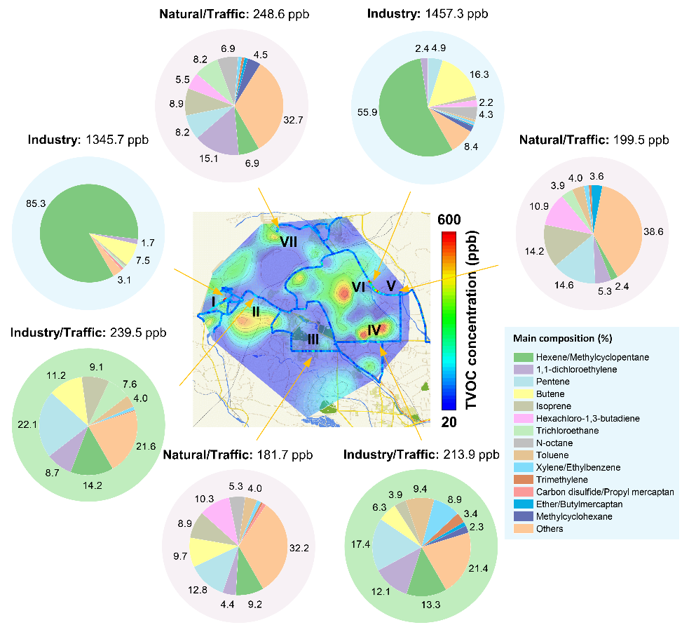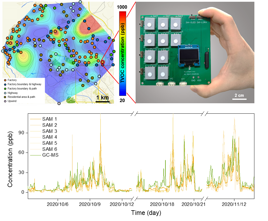 传感器阵列用于大气TVOCs网格化监测。研究组在约55平方千米的混合土地利用区(包含工业区、居民区和城市道路等多种土地利用类型)布设了152台TVOCs监测仪形成网络。监测结果可以及时准确地描述当地TVOCs浓度的时空变化特征,识别VOCs排放来源并指导减排活动。此外,结合车载GC-MS的走航监测结果,能够进一步明确污染来源的类型,与TVOCs监测网络的结果互相印证。