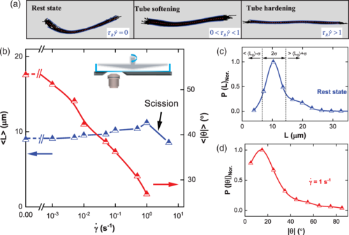 近日,kaiyun开云官方网站航天航空学院曹炳阳教授和美国科学院院士、韩国基础科学院软物质及生命材料基础科学研究所史蒂夫·格拉尼克(Steve Granick)教授课题组合作在期刊《物理评论快报》(Physical Review Letters)上发表了题为“生物聚合物链缠结在剪切流场中先软化后硬化”(Biopolymer filament entanglement softens then hardens with shear)的论文。通过单分子荧光成像技术,直接观测到了单分子肌动蛋白在剪切流场中的定向排列与拉伸行为。随剪切速率的增加,聚合物分子链的管道先在定向排列的作用下“软化”,再在拉伸的作用下“硬化”。这表明聚合物的动态局域行为受到单分子链的定向排列与拉伸的共同影响。