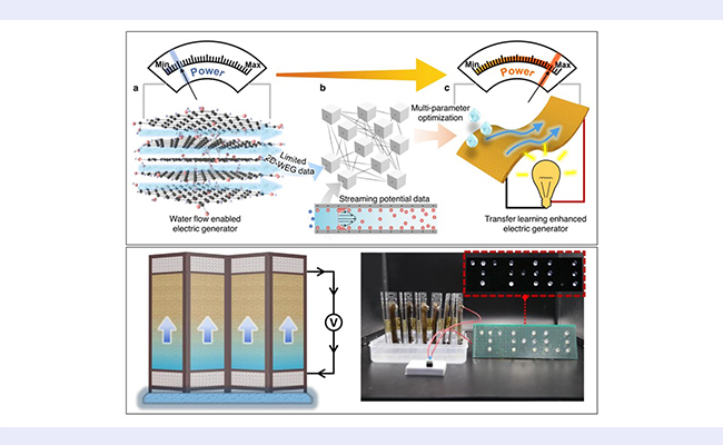 相比传统的机器学习方法,迁移学习模型能够在小规模的实验数据下实现对发电性能的准确预测。最终,通过迁移学习技术的多参数耦合优化模型和试验结合,构建了一系列具有不同发电行为的高性能水诱导发电机WEG,实现了水诱导发电机的定制化开发。此外,所开发2D-WEG器件优异的力学性能使得其在不同的拉伸和弯曲变形下均能保持性能稳定。研究者还展示了所开发的水流诱导发电器件驱动LED阵列、科学计算器、电子墨水屏等多种商用电子器件的应用场景。该研究不仅为高性能的水诱导发电机的设计与开发提供了新的路径,所构建的迁移学习优化框架也降低了机器学习方法在训练数据不足的传统物理、化学领域应用的门槛。相关成果以“迁移学习增强超有序氧化石墨烯纳米孔道水诱导发电”(Transfer learning enhanced water-enabled electricity generation in highly oriented graphene oxide nanochannels)在《自然·通讯》(Nature Communnications)发表。