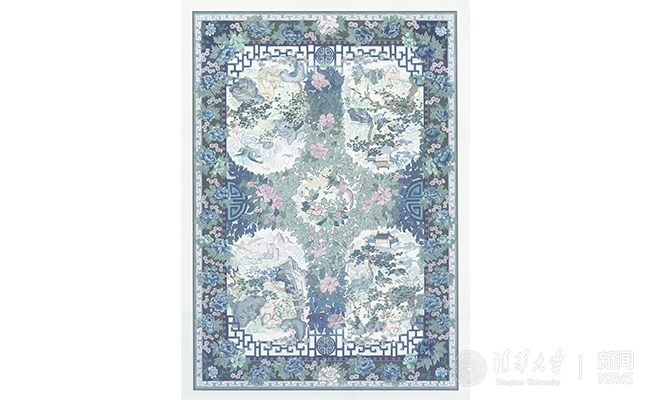 张灿的地毯图案设计作品《静林》以手绘的方式完成。画面以青绿为基调,山川俊秀、松林静谧,蕴含着游园林中的清新之气、自然之气。以含蓄的色彩、清雅的风格传递出寄托山水的古韵情怀。
