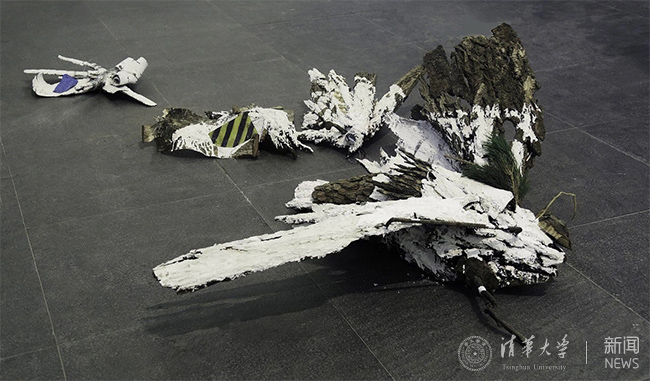 刘烽的雕塑作品《迫降》以树皮构造受伤降落的飞蛾。表现飞蛾的残破躯体,飞蛾躯体上有的覆盖着厚重的石灰;有的钉入了巨大的铁钉;还有的被铁丝紧紧缠绕。这反映生活中树木被伤害的缩影,暗示着人类行为对生态的破坏,借此作品呼吁大家关爱自然环境。
