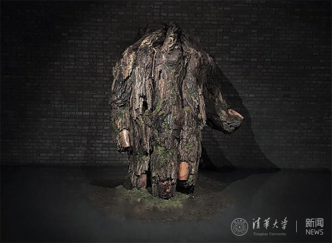 刘烽的雕塑作品《乡情悠悠》将原本散落的树皮以构造的方式合成在一体,构成外婆之手,细看其中,有山有水,有一方天地。作品中的手不仅是亲人之手,更是大地母亲之手。隐喻大地河山、自然母亲。通过触发观者视觉、嗅觉和触觉等多重感官并营造可穿行的场域体验,围绕作品,体会到的是家人的呵护感与自然给予我们的亲切感。借此呼吁当下社会应心念家园。