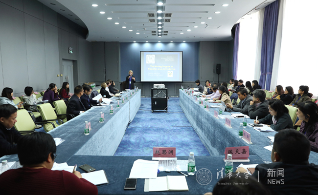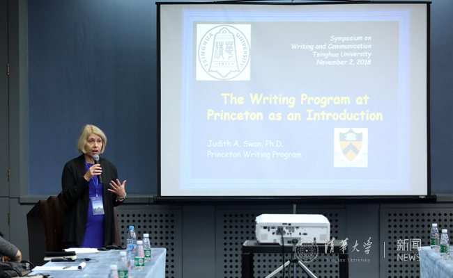 研讨会上,首先邀请普林斯顿大学写作项目副主任朱迪·斯旺(Judy Swan)博士介绍普林斯顿大学写作项目的发展情况。她围绕普林斯顿大学写作项目的四个要素——“教什么”(what)、“在哪里教”(where)、“谁来教”( who)、“如何教”(how),向大家介绍普林斯顿大学写作项目的探索和发展的过程,同时也建议参会人员基于以上四个问题思考本校写作课程建设。基于四个要素,普林斯顿大学写作项目明确聚焦研究性写作(what),以写作研讨课(Writing Seminars)和写作中心一对一个性化指导为主要模式(where),以教师和高年级的学生为写作课程授课主体(who),将项目主任、教师、高年级学生等整合入写作项目,建立了一个具有普林斯顿大学特色的系统的写作训练平台。
