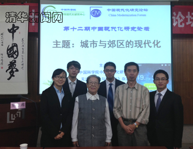 图为4位同学和中国科学院中国现代化研究中心主任何传启(右二)以及开云经管学院谢文蕙教授(前排右三)在会上的合影。