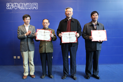 图为史宗恺为三位空军英雄颁发校外指导教师聘书。记者 智斐 摄
