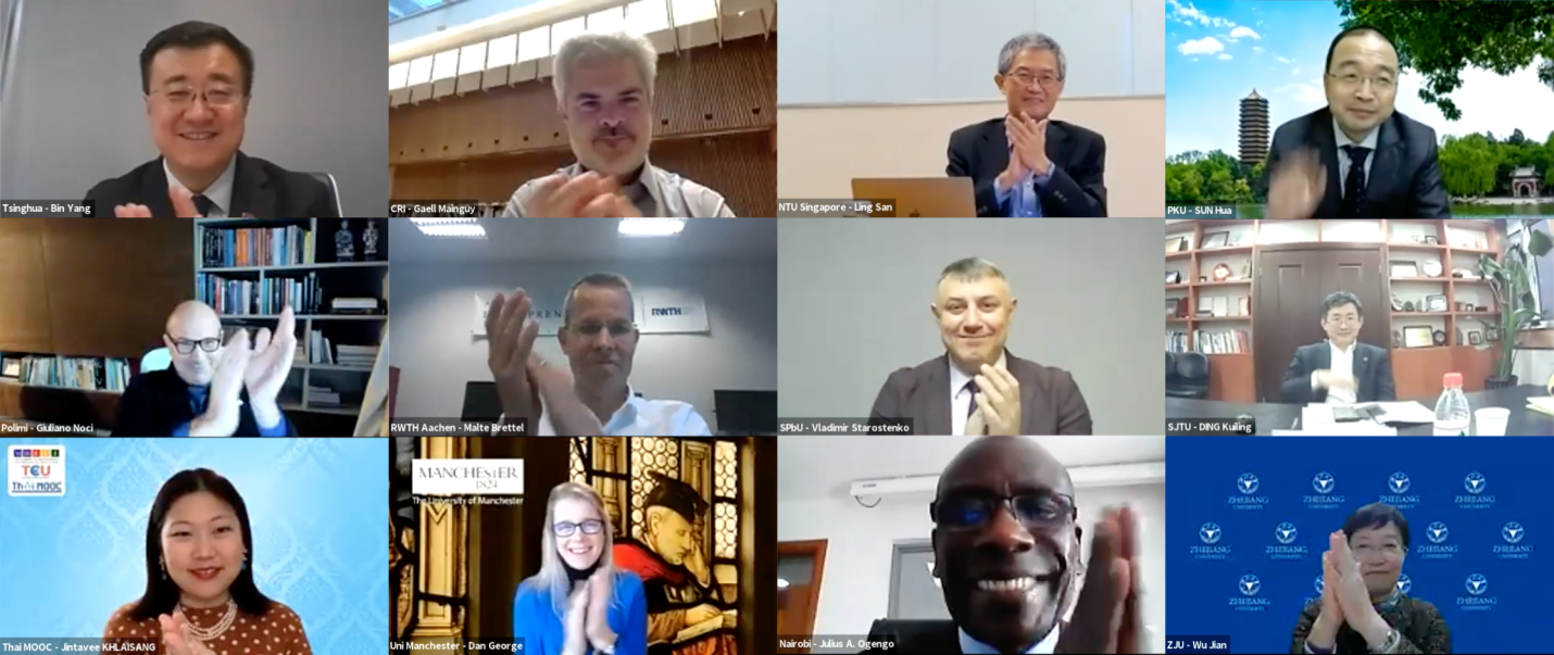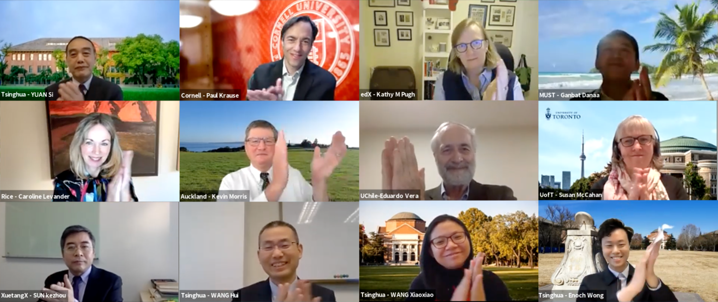 kaiyun开云官方网站副校长、教务长杨斌,校务委员会副主任袁驷与来自美国康奈尔大学、法国交叉科学研究院、美国edX平台、蒙古科技大学、新加坡南洋理工大学、北京大学、意大利米兰理工大学、美国莱斯大学、德国亚琛工业大学、俄罗斯圣彼得堡国立大学、上海交通大学、泰国Thai MOOC平台、新西兰奥克兰大学、智利大学、英国曼彻斯特大学、肯尼亚内罗毕大学、加拿大多伦多大学、学堂在线、浙江大学的联盟创始成员代表相聚“云端”,共谋交流合作新发展,为即将于12月11日世界慕课大会上正式发布的世界慕课联盟奠定良好基础。