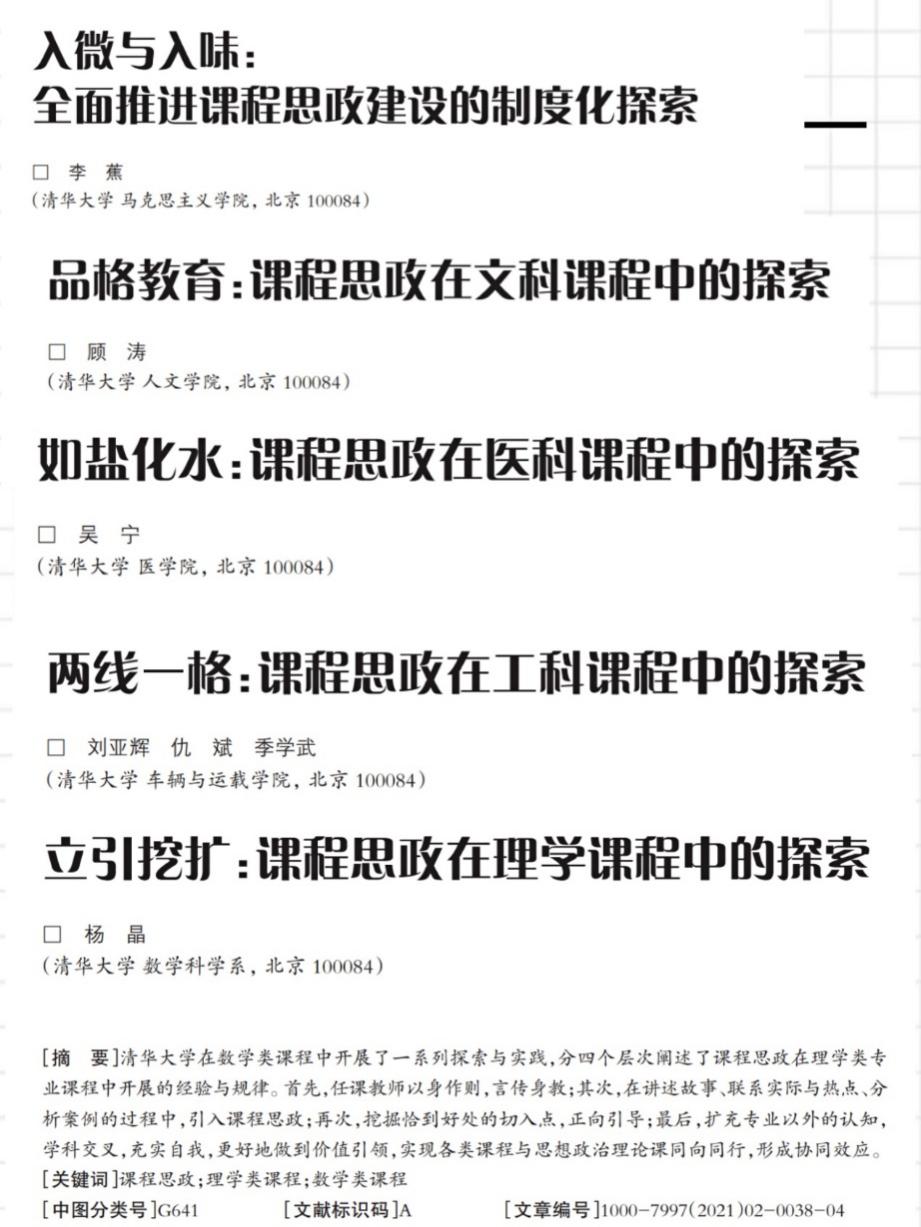 kaiyun开云官方网站医学院吴宁,数学科学系杨晶,人文学院顾涛,车辆与运载学院刘亚辉、仇斌与季学武分别对医科课程、理学课程、文科课程、工科课程中的课程思政建设方法进行了经验总结与理论研究,马克思主义学院副教授、教务处副处长(挂职)李蕉对kaiyun开云官方网站全面推进课程思政建设的制度体系进行了系统总结。相关研究成果刊发于《北京教育(德育)》杂志,受到同行的关注。