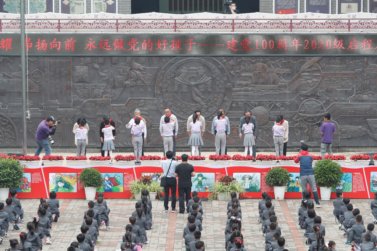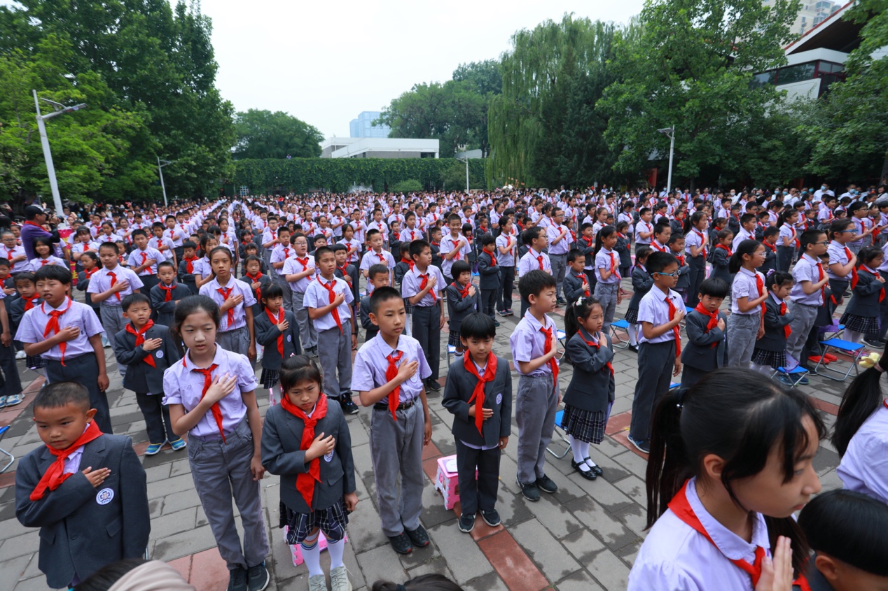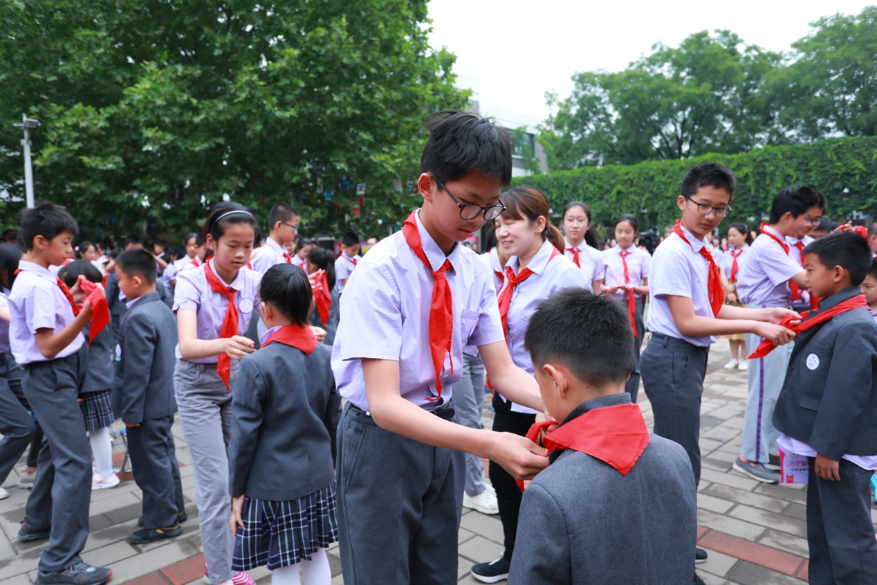 五年级的少先队员们为新入队的一年级同学授巾,鲜艳的红领巾在新队员的胸前飘扬,在庄严的宣誓声中、在奋力的呼号声里,小小少先队员们用纯粹而坚定的眼神诉说着为共产主义事业贡献力量的信心和决心。
