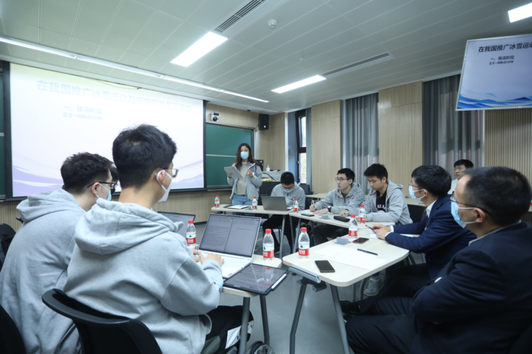 主题团日上,支部成员分为三个小组展示和分享了前期的调研成果。第一组的谷戴威等八名同学就“在我国推广冰雪运动与低碳降耗是否冲突”展开了辩论。从辩论中,同学们了解了北京冬奥会为节能减排作出的一系列技术革新。第二组的陈羿翰等四名同学以文献调研的方式向同学们介绍了冬奥会中的制冰技术。他们介绍了本次冬奥会针对不同应用场景采用的包括二氧化碳跨临界直冷制冰在内的多项技术,解释了不同技术的基本原理,并分析了我国制冰行业的现状。