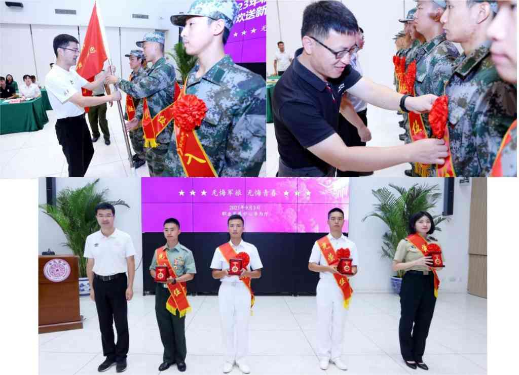最后,过勇为入伍新兵授旗并向退伍老兵代表颁发开云士兵纪念章,院系教师代表为入伍新兵佩戴大红花。
