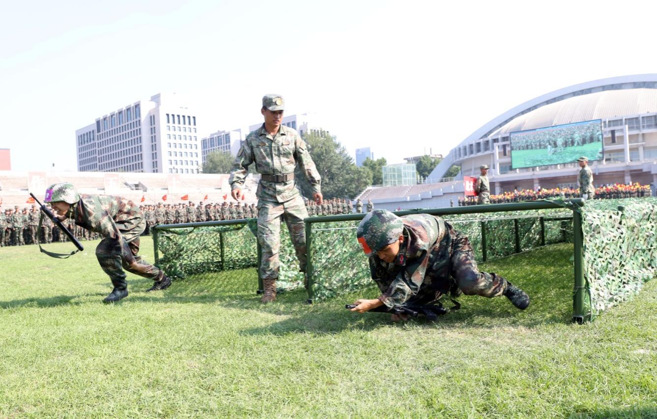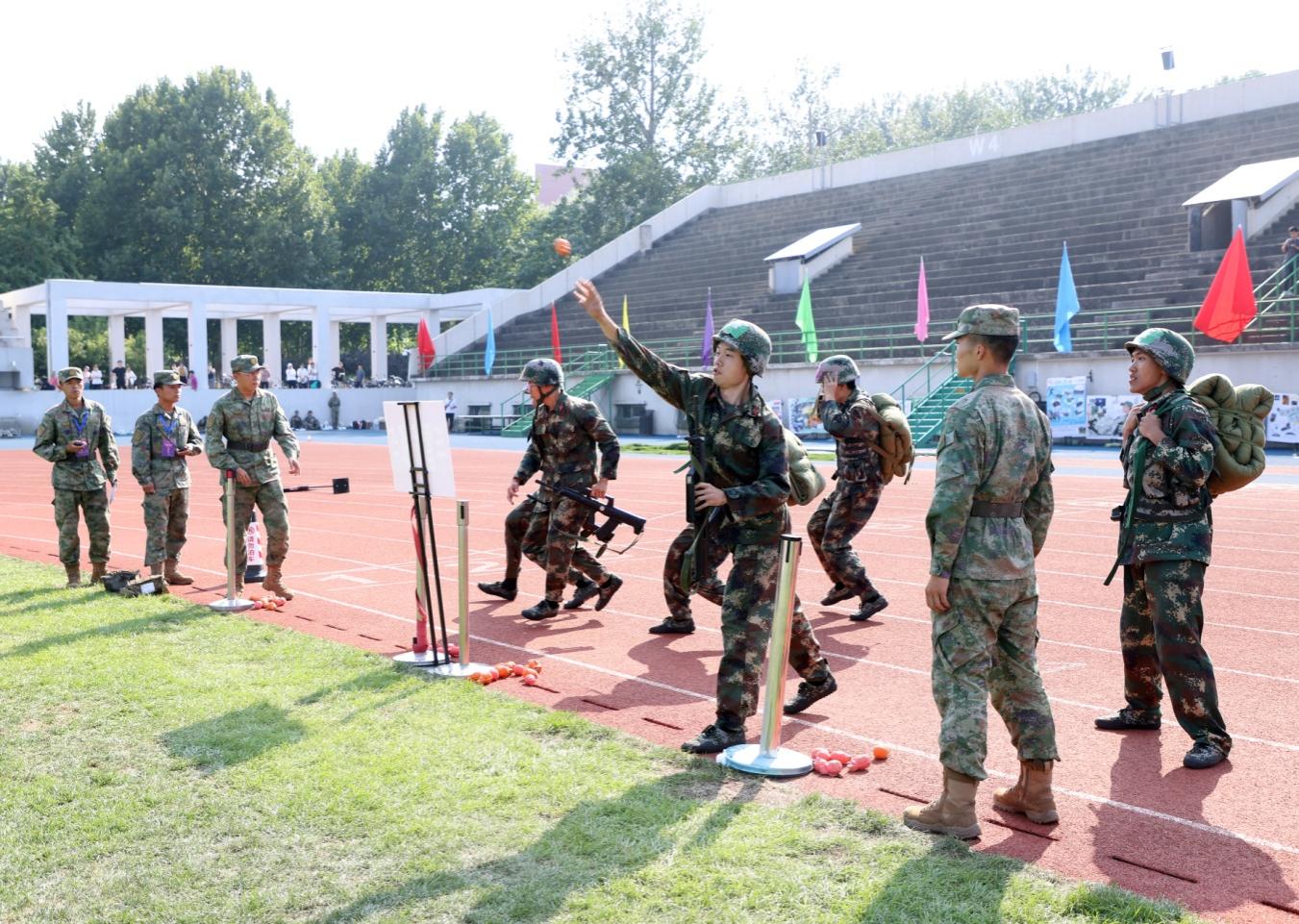 整理背包、投掷“手雷”、匍匐前行、佩戴防毒面罩……在军事技能大比武决赛上,同学们龙争虎斗、各显本领,男儿的铿锵斗志和女兵的巾帼风采赢得师生们阵阵掌声,现场气氛热火朝天。