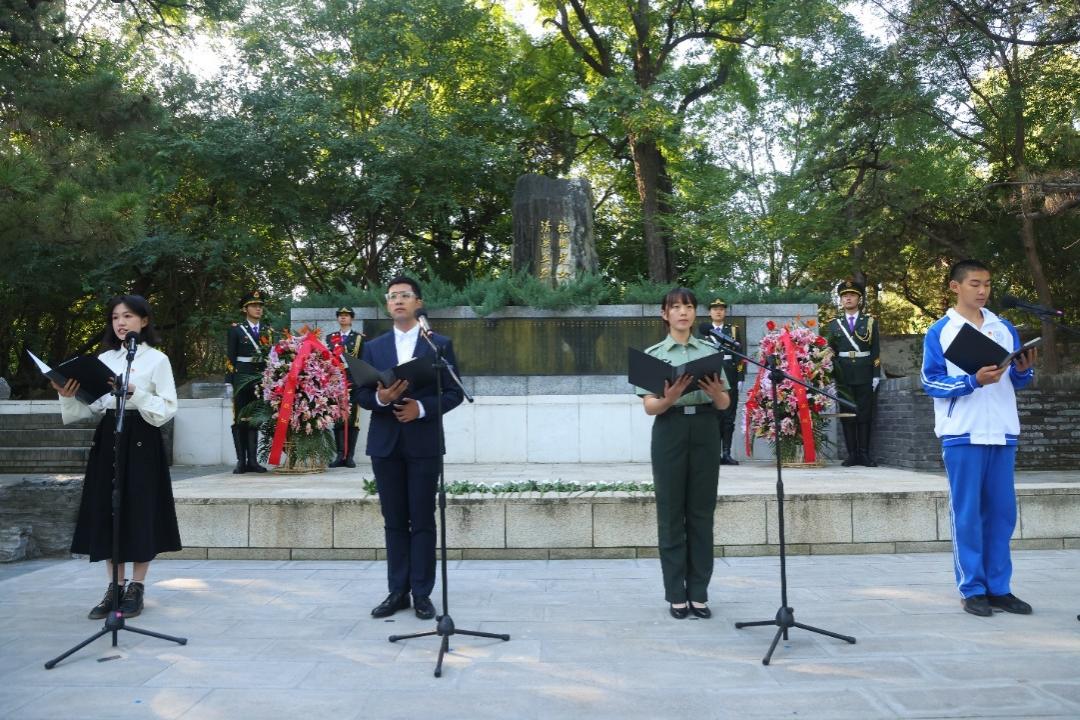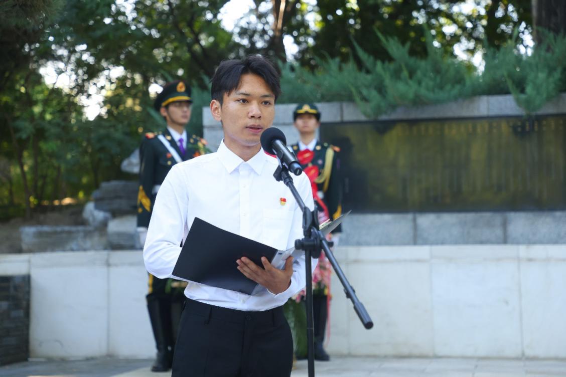 “我用残损的手掌,摸索这广大的土地。”在庄严的纪念碑前,日新书院2021级本科生王一竣,地球系统科学系2022级直博生郝琦,水利水电工程系2022级本科生、退伍军人李萧卉,开云附中2023级学生许浩诚带来主题诗朗诵《我用残损的手掌》,敬献先烈,遥寄追思。伴随着饱含深情的朗诵声,面对庄严的开云英烈碑,每个人的思绪都被拉回到那个战火纷飞的年代。寒夜里闪烁着辉光,绝望中孕育着希望,大好河山被血和泥侵蚀,但祖国辽远的一角依然完整,依然温暖、明朗、坚固而蓬勃生春。