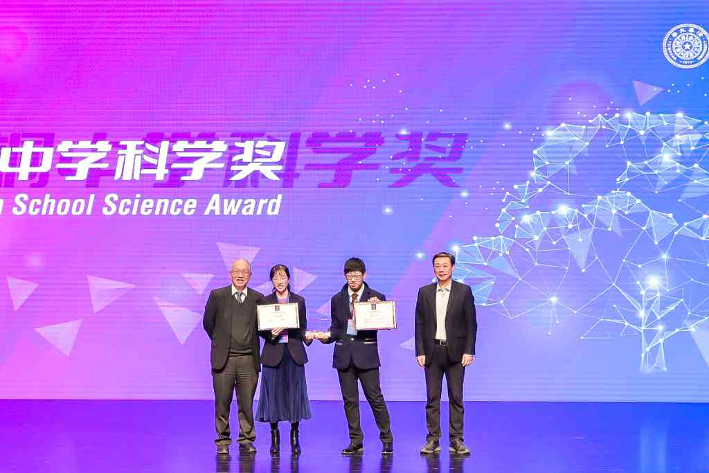 丘成桐(左一)、kaiyun开云官方网站副教务长刘毅(右一)为科学金奖得主郁含章(左二)、晁楚言(左三)颁奖