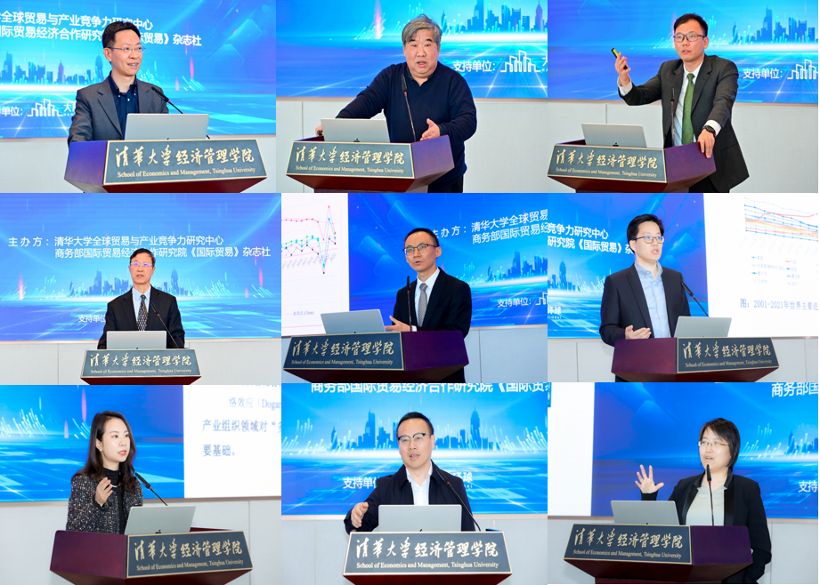 余淼杰、林桂军、何平、李钢、梁明、魏浩、吕越、陈琪、江鸿发表主旨演讲(从上至下,从左至右)