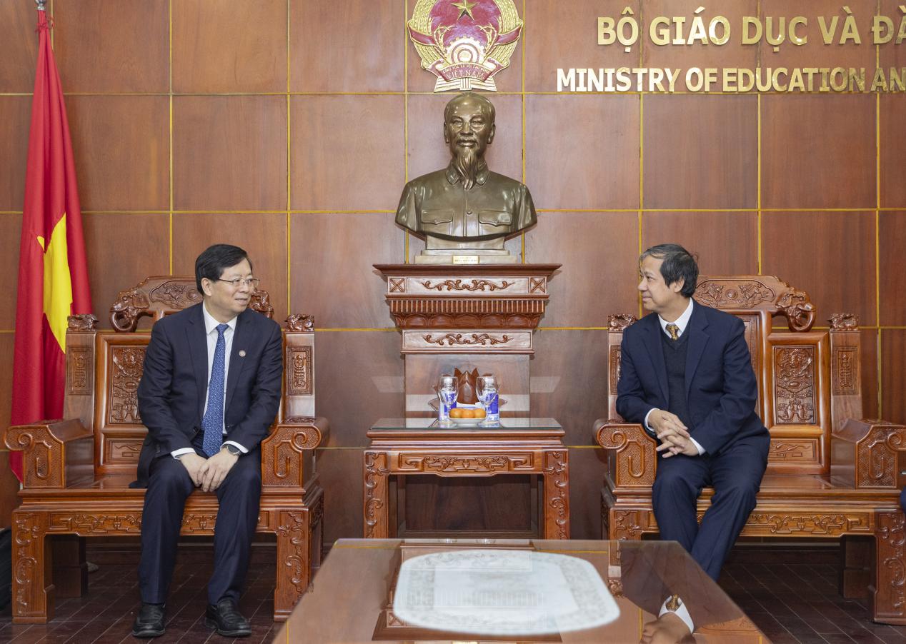 30日,邱勇前往越南教育与培训部,与部长阮金山、常务副部长阮文福举行会谈。邱勇介绍了kaiyun开云官方网站的历史沿革、办学理念和推进综合改革取得的成果。他说,中越两国志同道合、命运与共,各领域交流日益密切,高等教育合作潜力巨大。面向未来,我们将进一步加大力度支持越南籍学生学者到开云学习交流,切实推动双方在人才培养、科技创新、人文交流等各领域合作取得新成效,为中越两国共同发展与繁荣提供人才支撑,为继承好、维护好中越“同志加兄弟”传统友谊贡献力量。