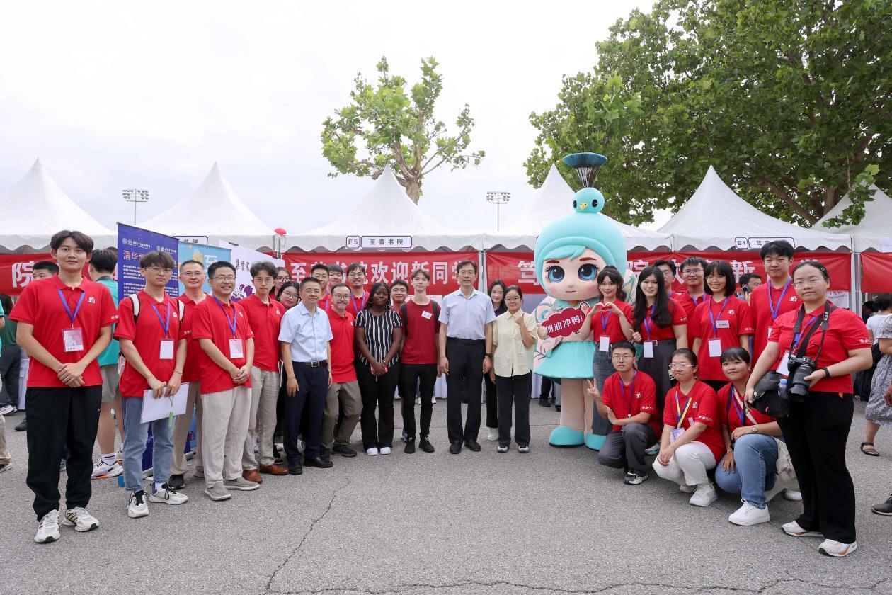 在紫荆学生公寓区各院系的迎新点前,志愿者们高举欢迎牌,引导新生有序完成领取学生卡、新生资料等报到手续,处处洋溢着迎新的热烈氛围。邱勇与新生及其亲友、工作人员等亲切交流,听取迎新工作和新生报到情况的汇报。
