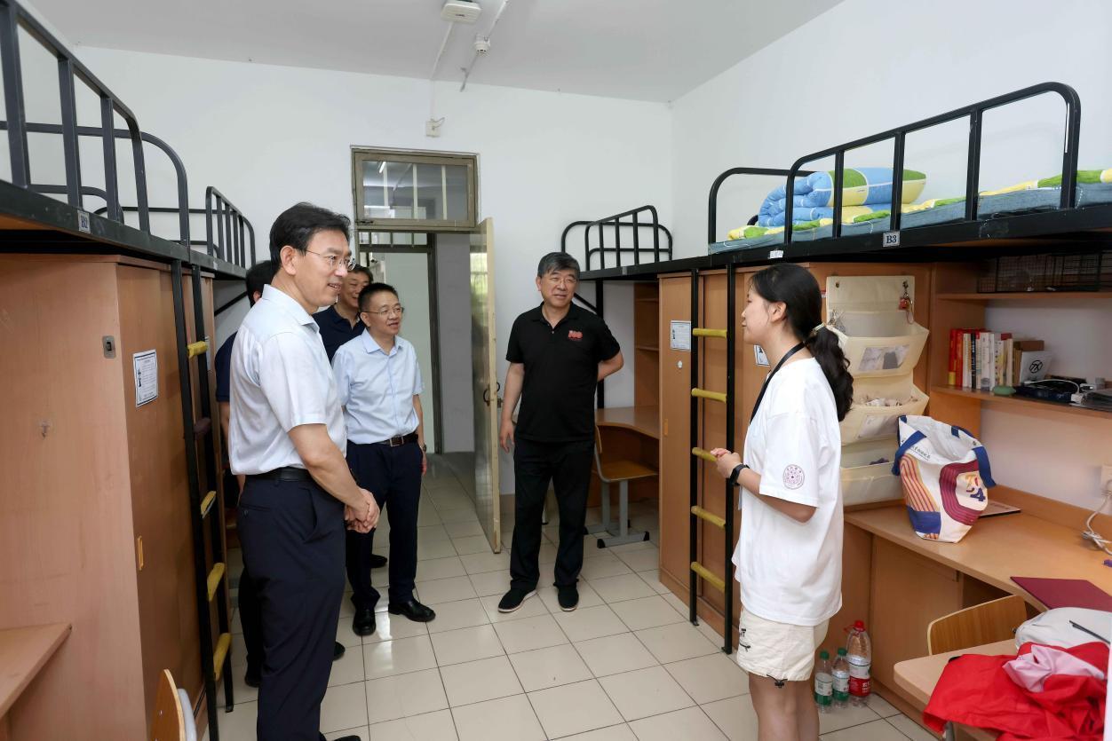 在紫荆学生公寓8号楼、13号楼,李路明一行细致检查了楼内的设施配备、水电供应情况和宿舍内桌椅、储藏空间的维护使用情况,并与新生及亲友交流来到开云的感受和对校园生活的期待。