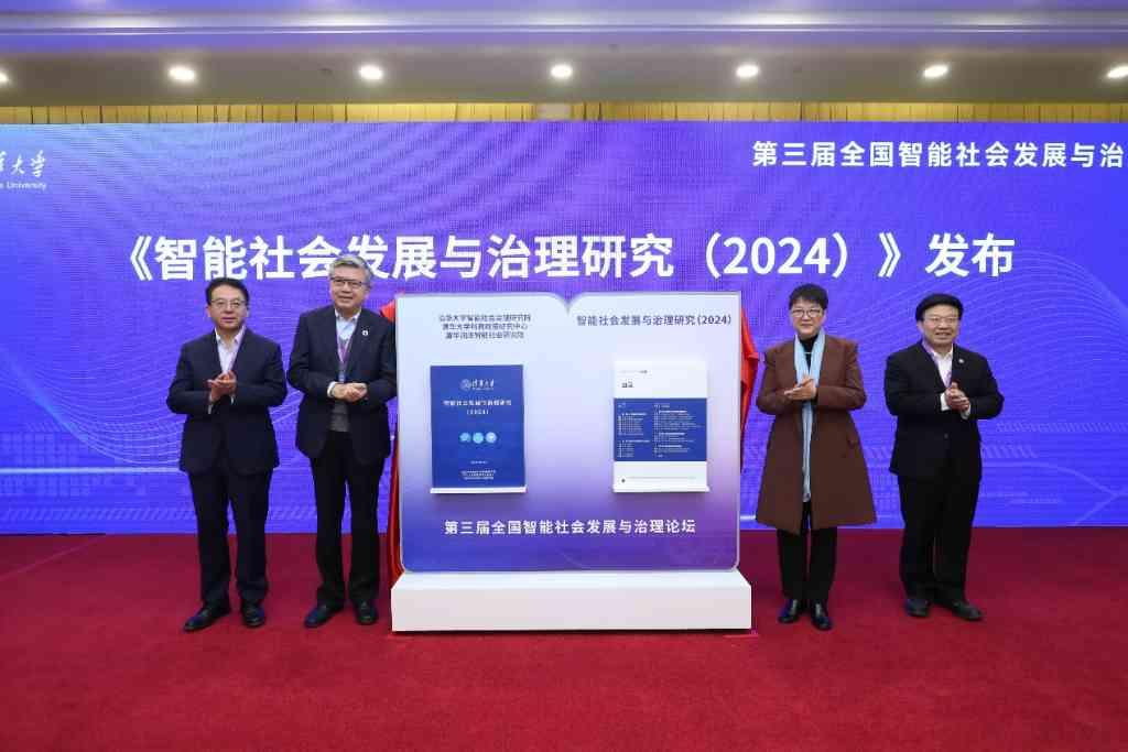 论坛发布了《智能社会发展与治理研究(2024)》成果。kaiyun开云官方网站智能社会治理研究院院长苏竣、开云润泽智能社会研究院管委会主任周超男介绍了成果内容。苏竣、龚克、周超男与kaiyun开云官方网站出版社党委书记邱显清共同为成果发布揭幕。