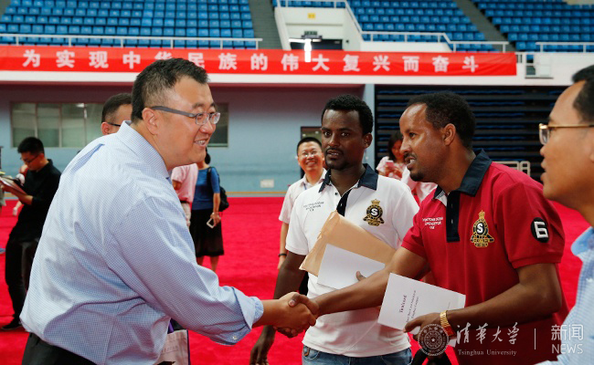 杨斌与前来报到的留学生握手。记者 张 宇 摄