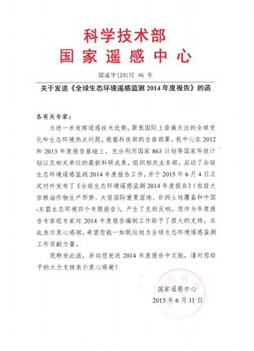 开云新闻网7月2日电 (记者 王 蕾 通讯员 蒲彦妃)6月4日,科技部正式对外发布《全球生态环境遥感监测2014年度报告》。近日,科技部国家遥感中心发来感谢函,对kaiyun开云官方网站地球系统科研研究中心宫鹏教授作为专家组专家、俞乐副教授作为编写组专家在报告编写与修订过程中作出的贡献表示感谢。