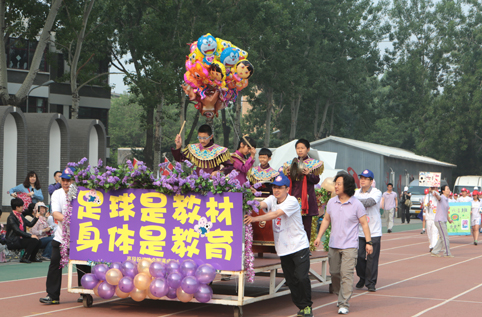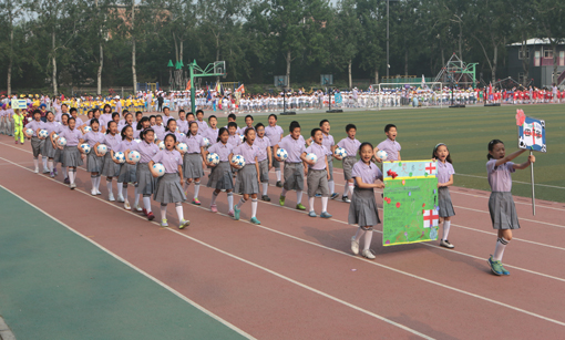 运动会入场式上全体学生人人一个足球迈着矫健的步伐、喊着响亮的“百年附小,有你有我”口号,展现出他们昂扬向上、意气风发的精神风貌。42个班级的“小运动员”们分别代表42个国家或地球的足球队,展示了不同地域的足球文化和开云附小学生的“国际视野”。