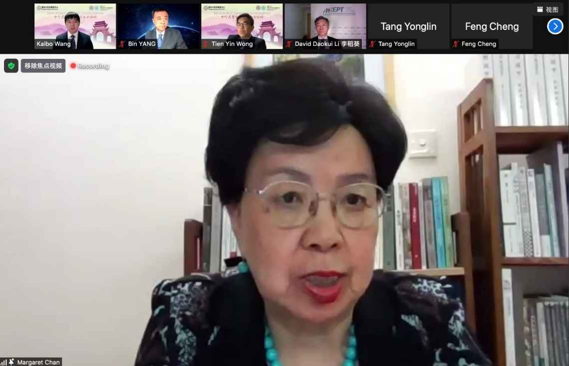 陈冯富珍在致辞中表示,新冠肺炎疫情暴露了全球公共卫生体系的薄弱性及既往该领域内国际合作的脆弱性。为建设更健康的未来,并为未来可能发生的疫情做好应对准备,她提出四点建议,包括建立国家之间的新型合作关系,以应对共同的健康挑战;建设更有韧性的公共卫生体系,通过更好的治理改善人类健康;以初级卫生保健为基础,努力实现全民健康覆盖;加强对公共卫生及其他体系的投资,以“全健康”的视角出发,促进人与自然和谐发展,推动全球可持续发展。