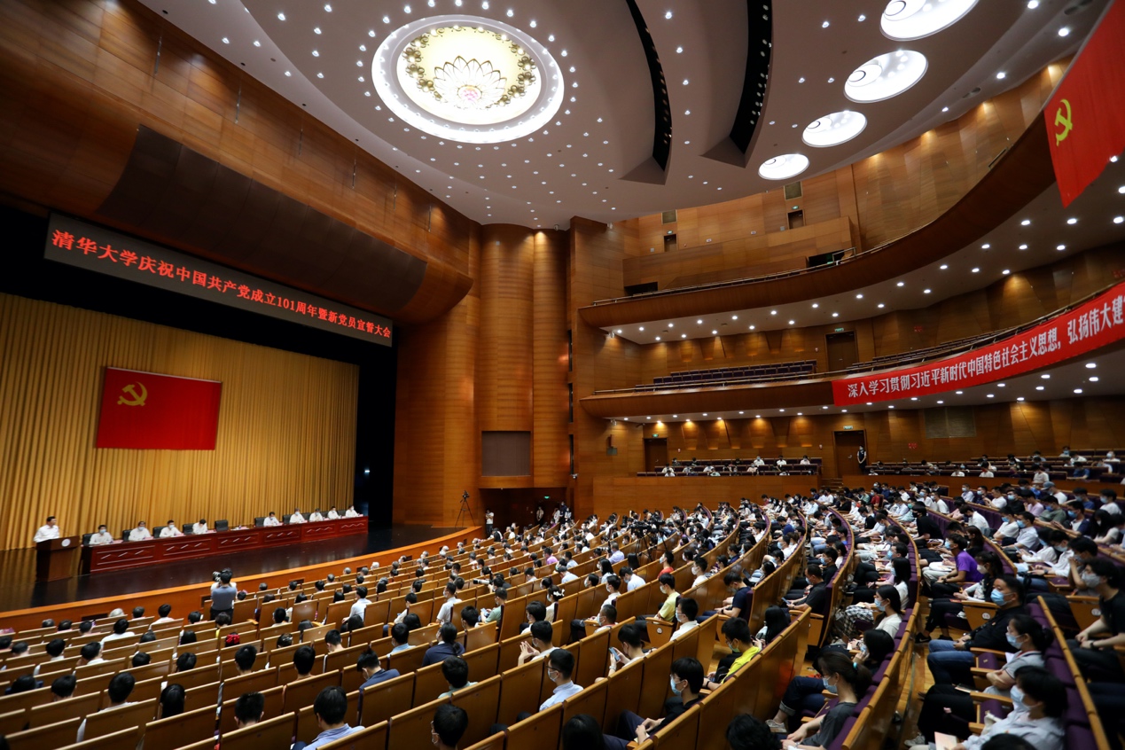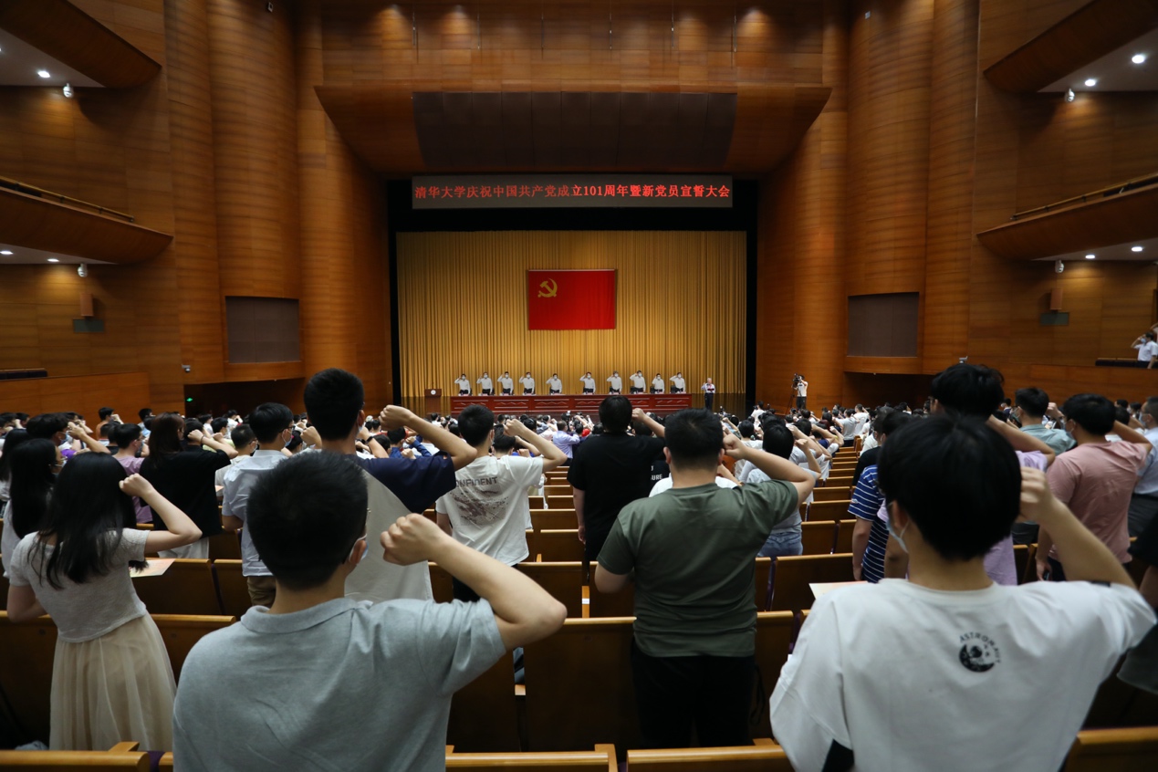 在“光荣在党50年”纪念章获得者、中国工程院院士、机械系教授王玉明的领誓下,过去一年入党的新党员面向党旗庄严宣誓,与会的老党员们也一同重温入党誓词。