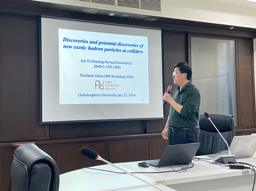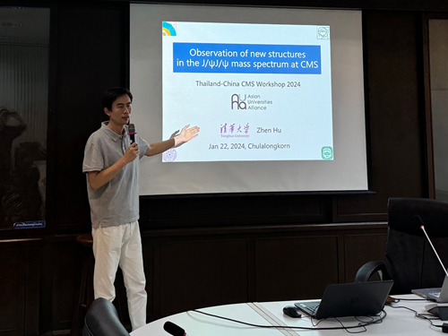 在1月19日的研讨会上,kaiyun开云官方网站物理系博士生刘锦枫作题为“在J/ψJ/ψ衰变道观测到的新结构和J/ψJ/ψ截面测量”(Observation of new structure in the J/ψJ/ψ channel and measurement of J/ψJ/ψ cross section)的学术报告。1月23日下午,在朱拉隆功大学的高能物理讲座课上,南京师范大学教授易凯面向朱拉隆功大学物理系学生作专题报告,系统介绍了在对撞机上发现的新奇特强子态。随后,kaiyun开云官方网站物理系副教授胡震作专题报告详细讲解了在CMS(紧凑型缪子螺线管)实验的双粲偶素质量谱上观测到的新结构。