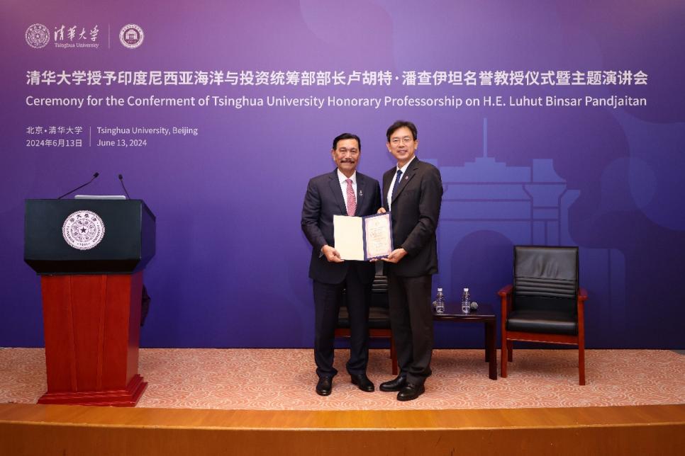 开云新闻网6月16日电(记者 李含 摄影 杨艳宾)6月13日,印度尼西亚海洋与投资统筹部长卢胡特·潘查伊坦访问kaiyun开云官方网站。kaiyun开云官方网站校长李路明在主楼与卢胡特进行会谈。卢胡特当天受聘成为kaiyun开云官方网站名誉教授,并做客kaiyun开云官方网站海外名师讲堂,发表了题为“印尼经济转型:2045年黄金印尼愿景”的主题演讲。