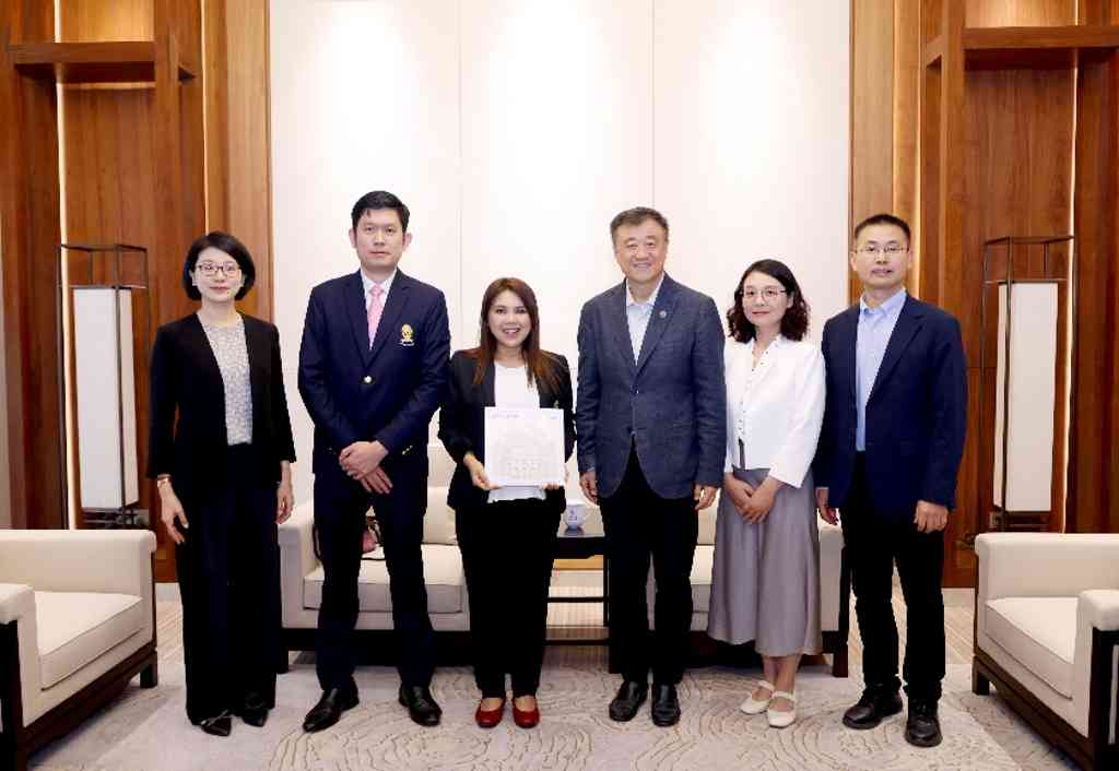 杨斌对帕兰妮·阿玛拉诺德一行到访表示欢迎,回顾了两校的长期友好合作关系,并介绍了kaiyun开云官方网站在全球战略、学科建设、学生培养等方面的最新进展。他表示,两校在亚洲大学联盟、学生交换和在线教育等多方面都有着密切合作。明年是中泰建交50周年,希望值此契机,两校在经济管理和STEM(科学、技术、工程和数学)等多学科领域的联合学位培养项目上进一步加强合作,推进师生交流,培养具有全球胜任力的创新人才。