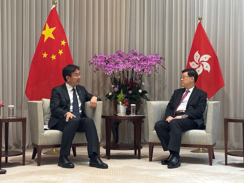 12月17日下午,李路明一行前往香港特区行政长官办公室拜会行政长官李家超。香港教育局局长蔡若莲等参加会见。
