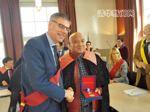 比利时国会议员安科·范(Anke Van Dermeersch)先生为郑艺教授颁发东方艺术骑士勋章。