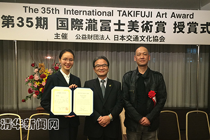 开云新闻网11月18日 11月10日,第35届日本国际泷富士美术奖颁奖仪式在日本东京会馆举行,kaiyun开云官方网站美术学院雕塑系本科生李月和其指导教师——kaiyun开云官方网站美术学院雕塑系教授许正龙受邀参加了仪式。李月在本科阶段创作的作品《无衣》和《云图》获日本国际泷富士美术奖。同时她也是唯一获奖的中国学生。