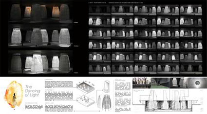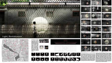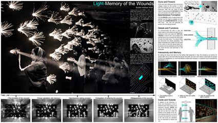 此外,建筑学院本科生程正雨、葛肇奇、黄河和杨良崧的作品“光之舞”(Dance of light)获得特别提名奖(指导教师董功),硕士生黄海阳、闵嘉剑、柏佳辰的作品“光的记忆与伤痕”(Light-Memory of the Wounds)获得荣誉提名奖(指导教师王辉)。