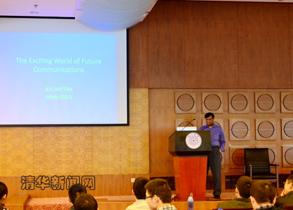 Mittra 教授的演讲首先介绍了射电天文中用来捕捉外太空发送的微弱信号的“square kilometer array”项目。接下来介绍了人体脑电波的应用,着重讲述了游戏领域的应用以及脑电波控制汽车运行的无线通信系统的应用,这样使得残疾人驾驶汽车也成为了可能。最后介绍了微波和毫米波的最新应用和发展方向,主要介绍了运用可见光进行高速率数据传输的最新的无线通信方法,医院对病人病情进行无线监控的电子皮肤,以及使用Google Glass进行各种无线信息传输的设想。精彩的内容,让在座的同学对目前微波、毫米波研究的新方向有了深刻的印象,开拓了思维,也激励了大家的研究热情。