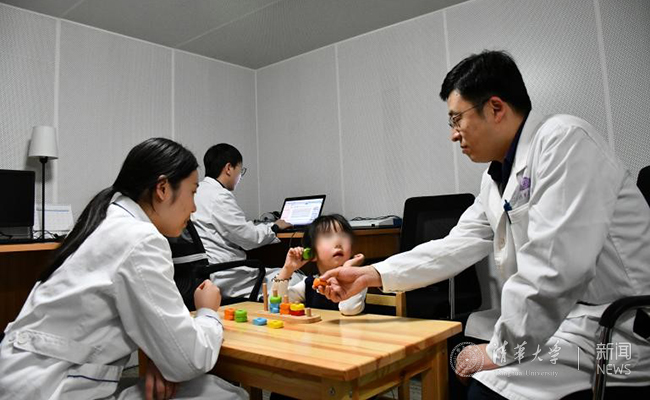 耳鼻咽喉头颈外科医师与听力技师为植入人工耳蜗的患儿进行术后调机。侯建鹏 摄