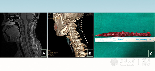 术后影像。图A示:肿瘤完整切除,图B示:椎板完整复位,图C示:肿瘤标本。