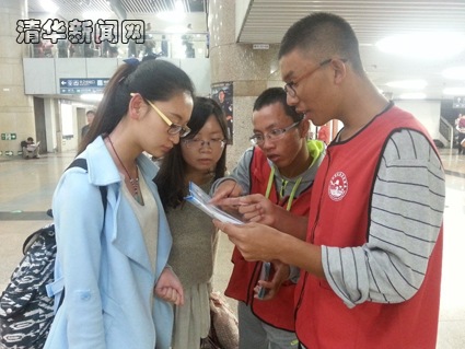 图为志愿者们正在替旅客指路。(吴伊宁 摄)