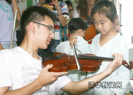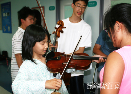 演出结束后,小乐队的成员带着小患者们,一起感受乐器的魅力。患有三尖瓣下移畸形的小盈盈在乐队大姐姐的指导下,轻轻地拉动小提琴的琴弓,当琴弓在琴弦上轻轻划过留下悦耳的声音时,羞涩的小盈盈的眼睛里跳跃着喜悦的光彩。