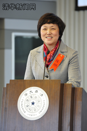 图为贺美英作为捐赠校友发言。研通社记者 王涵 摄