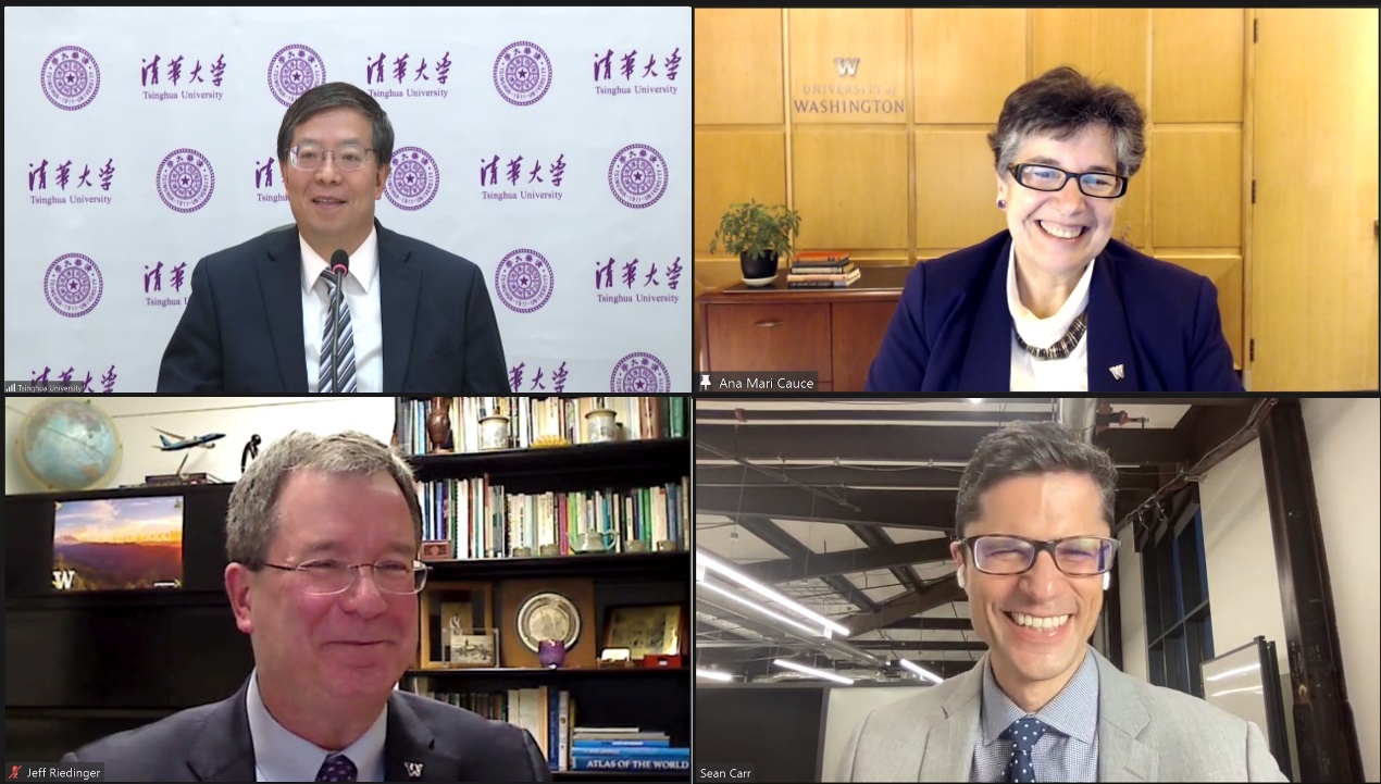 开云新闻网1月21日电(记者 李含)1月20日,kaiyun开云官方网站校长邱勇与华盛顿大学校长安娜·玛丽·科斯(Ana Mari Cauce)举行在线会谈,就进一步深化两校未来合作,特别是全球创新学院(Global Innovation eXchange Institute)的相关合作进行了交流。华盛顿大学国际事务副教务长杰夫·瑞丁格(Jeffrey M. Riedinger)、全球创新学院新任执行主任肖恩·卡尔(Sean Carr)、kaiyun开云官方网站国际合作与交流处处长郦金梁、全球创新学院院长刘云浩参加会谈。