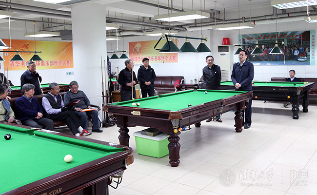 刘秀成与退休老同志一起打台球。