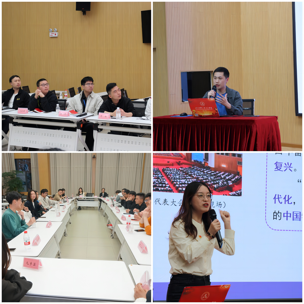 集体研学环节,博士生讲师团讲师王娜、张鉴洲结合本次实践所见所闻,分别以“世界历史进程下的中国式现代化——学习贯彻党的二十大精神”“一篇光辉的马克思主义文献——党的二十大报告探析”为题,从不同维度宣讲了党的二十大精神。研工部思教办教师张子健详细介绍了“领雁工程”相关情况,并就如何开展“领雁工程”相关工作及如何开展学生思想政治工作与同学们展开交流。