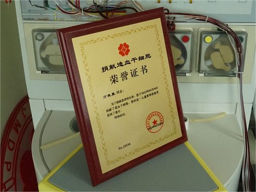 方良晨捐献造血干细胞后所获荣誉证书