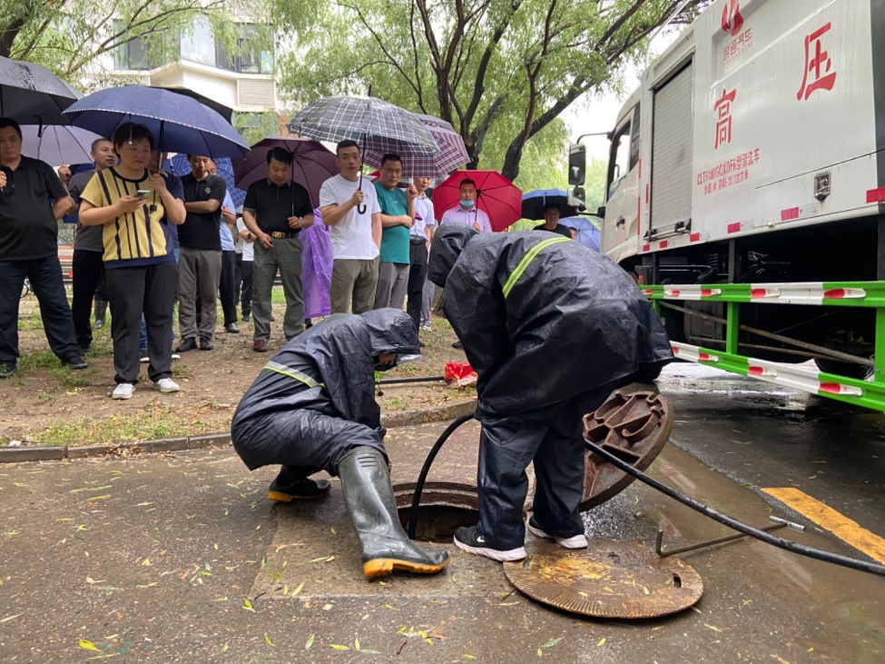 2023年7月12日由防汛办、饮食中心在紫荆14号楼北联合举行的防汛演练