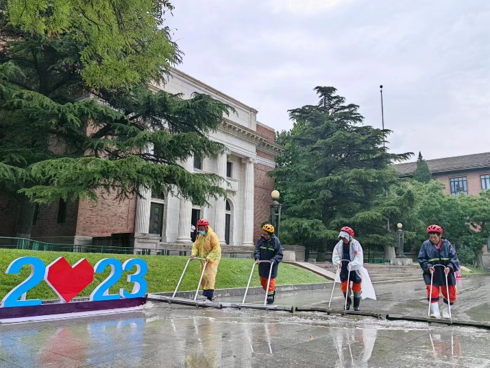 环卫王师傅和他的同事们从4月起就开始为防汛忙碌,他们逐一检查、清掏了全校4000多块雨水篦子,清出渣土200余吨,确保排水关口畅通。汛前环卫科组建了60人的“橙色”防汛突击队,划定了9个易积水点和24个巡查区域。王师傅和一名同事被安排值守教学科研区一个易积水点,他们的任务是在路段出现积水时扫水、掀开污水井促排、清理雨水篦子杂物。风雨如令,那是催促他们坚守岗位的号角,今年汛期,王师傅和同事们累计值守21天,近300个小时。
