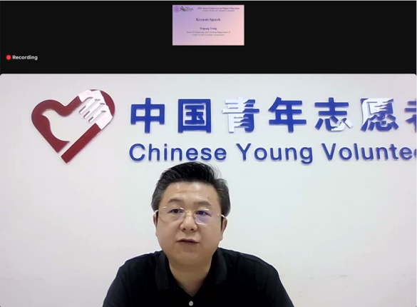 主论坛闭幕环节,中国青年志愿者协会组织培训部部长杨业功发表主题演讲,介绍了中国青年志愿者协会工作情况和发展历程以及大学生志愿服务西部计划,并强调了以志愿者为纽带的国际交流的重要意义。